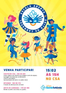 Uma das novidades do Escola Aberta é a exaltação ao Carnaval: a maior festa popular do país, comemorada este ano no dia 25 de fevereiro. Para isso, durante todo o dia, serão confeccionados adereços, como máscaras, faixas e colares, tudo ao som das tradicionais marchinhas de carnaval, o que promete animar toda a comunidade CSA.